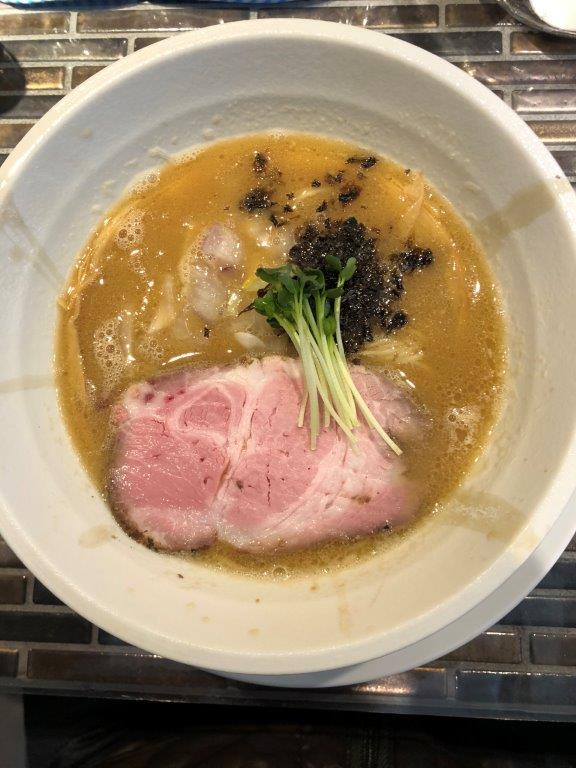 初訪なのでノーマルにしようかとも思ったが、鯛そばの鴨脂に惹かれて注文。一口すするとまず鴨脂の風味が感じ取れる。さらには濃厚な鯛の旨味が押し寄せてくる。初めのうちは良いが徐々に魚臭さが強く感じてしまう構成。飽きさせないほどの力強さか、味変的なものが欲しいところ。麺は細めのストレート。スルスルと啜れる食感はなかなか良いが、これといった特徴は無い。チャーシューはレアっぽいが水分が抜けたような感じでしっとり感がない。めんまは穂先メンマでとても長いもの。甘みのある味付けだがあまり柔らかく無い。海苔はとても風味が強く、魚介感が増す。大きめに切られた玉ねぎとカイワレが濃厚さをサッパリとしてくれて良い。全体的に店の外観の想像と違い、魚感の強い一杯に感じ、思ってたのと違う感が強かった。 |