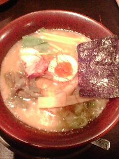 名前の通り鶏に加えて昆布や貝類の魚介系の出汁がとっても深く味わえる。これだけ魚介が強くても臭みも無くコクがあるのだがすっきりとした味わい。柚子胡椒の味わいはとてもいい風味でうまいのだが、かかっている部分だけで全体的には感じられなかったのが残念。麺は中細で縮れたやわらかめの麺。もう少しコシが欲しい。肉は小さいのが残念だが箸で持つとほぐれるほど柔らかく煮込まれてとてもうまい。味玉は半熟さはいまいちだがうまい。メンマもいい感じの柔らかめでうまい。その他の具として珍しい水菜、山くらげもいい感じだ。