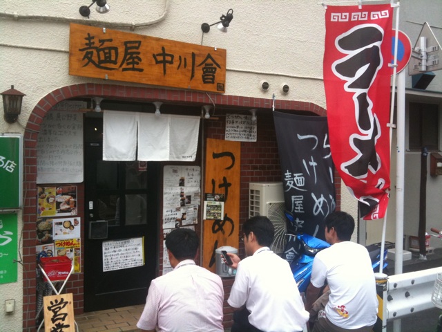 濃度の高くクリーミーな豚骨魚介スープのつけ汁。旨みと甘みのバランスがちょうど良いが、豚骨魚介系としてはありがちな味。特徴としては黒胡椒と七味の辛さが味を引き立てている感じ。麺は浅草開化楼の太麺。ツルツルとした舌触りとムッチリとした食感。中々食べ応えのあるいい麺。大盛無料などのサービスが無いのはちょっと物足りない。具はつけ汁の中にチャーシューとメンマ、麺の上に追加の味玉。チャーシューは分厚くかなりでかくてすごいボリュームだが、脂身が多く味付けもうすく後半はかなりもたれる感じ。メンマは甘みがある味付けで中々好き。味玉は色の割にはあまり味が染みておらず固めの半熟でいまいち。スープ割を頼むとバランス系のスープで割られたようで、あまりさっぱりとした印象では飲めない。また直接飲むと胡椒の風味がかなり強いことに気づく。トータルとしては今となってはかなりありがちな一杯で、新店の割にはオリジナリティに欠ける気がした。食べ終わった後の個性としてはスープ割の変わりにご飯を入れてカレー味変する楽しみ方が人気のようだ。 2011年4月オープンながら、テレビなどのメディアに何度か取り上げられる人気店。店舗の前には行列用の丸椅子が置いてあり、それぞれに何番目かが書いてある。入口には雑誌の切抜きやラーメン評論家やブロガーのサインまでもが張られていてゴチャゴチャしている。店内は厨房に向かうカウンター席とその後ろに一段上がった壁に向かったカウンター席。後述のカウンター席や内装などは手作りっぽい感じ。 |