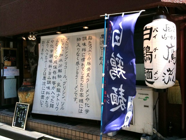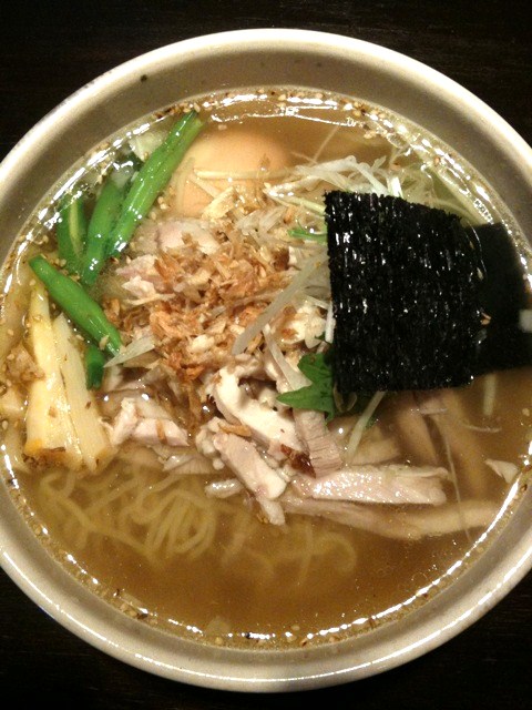 鶏の旨みが凝縮されながらもスッキリとした味わいの正統派のシンプルスープで、その旨さがダイレクトに分かる塩味。久しぶりに味わう繊細な味わいで非常にうまい。麺は中細で多加水な縮れ麺。スルスルとした食感で麺単体として特に印象に残るような感じではない。ランチタイムは麺の大盛無料サービス。大盛にしたがあまり多く感じなったので、通常の量では物足りなさそうだ。具はデフォルトにしてはかなり色々と、というよりゴチャゴチャと入っている印象。まず肉は鶏のササミっぽい部位の蒸し鶏が細切りに切られたもの。シンプルな薄味の塩味で、スープに良く合っている。メンマは薄い色だが結構しっかりとした味が付いていて、なかなか良い。珍しい具として高級中華野菜という金針菜というのが乗る。食感はアスパラのような感じで、オクラのような粘り気も少しある。珍しいが、これがスープに合うかというと微妙。中央には揚げネギが乗りスープへ風味が移るが、これは繊細なスープにはちょっと不要かと思えた。海苔の下にはネギと水菜。追加で烏龍玉子という珍しい味玉を投入。烏龍茶の風味は感じられるものの、それが玉子やスープに合うかというと、これまた微妙。他に別皿でふりかけのような薬味が「初めての方は後半に入れてください」といわれて出される。香ばしい風味が加わるが、これもスープの繊細でシンプルな風味が消されてしまい自分には合わなかった。最近は味噌や濃厚な豚骨魚介系が続いており、こういったシンプルな味わいのスープは久しぶりだったが、かなりの高レベルに思えた。しかし色々な具や薬味で味に変化が付いてしまったのがどうも合わなかった。この味ならばスープ本来の味だけで十分勝負できると思えただけに残念。 |
