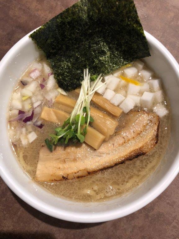濃厚ホタテそばの名の通り、ホタテの濃厚な旨味が満載なスープ。ベースの動物系のスープもどっしりとしており、ホタテの旨味を包み込むように調和している良いバランス。濃厚でもそこまでくどくはなく、最後まで飽きずに飲み干せた。麺はもっちり食感の若干縮れた太麺。全粒粉を使用しており、小麦の風味も感じられる。濃厚なスープにも負けておらず良い存在感。具はチャーシュー、メンマ、玉ねぎ、大根、三つ葉、海苔、柚子の皮。チャーシューは巻いてないバラ肉で炙ってある。柔らかくて香ばしい。メンマは太くてさっくり系。面白いのが大根で、見た目は玉ねぎのように賽の目状に切られている。濃厚なスープの口直しにシャクっとした歯ごたえとさっぱりとした味がとてもよく合う。カイワレのサッパリ感や柚子の皮の清涼感もあり、濃厚スープを飽きさせないための工夫が感じられる。歳のせいか、この手の濃厚系は初めは良くても飽きがくることが多いが、こちらはしっかりと対策がとられており食べやすい味となっており良かった。